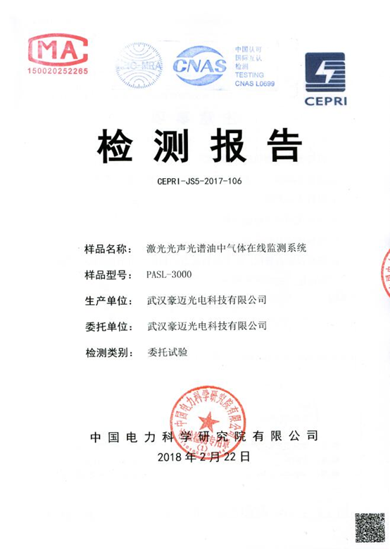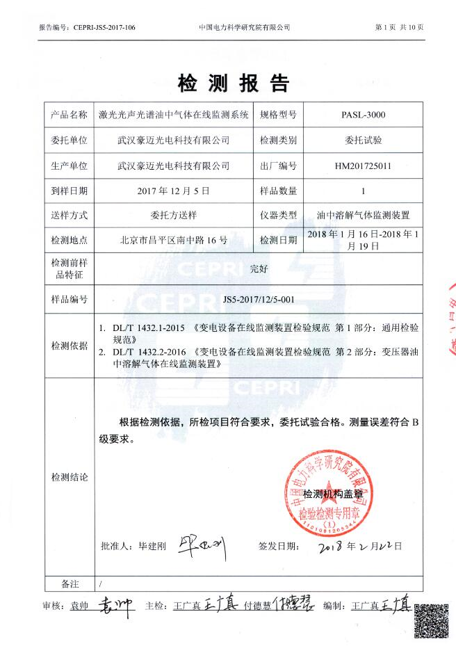 激光光聲光譜油中氣體在線監(jiān)測系統(tǒng)順利通過中國電科院試驗(yàn)檢測,達(dá)到B級(jí)標(biāo)準(zhǔn),成功拿到準(zhǔn)入證