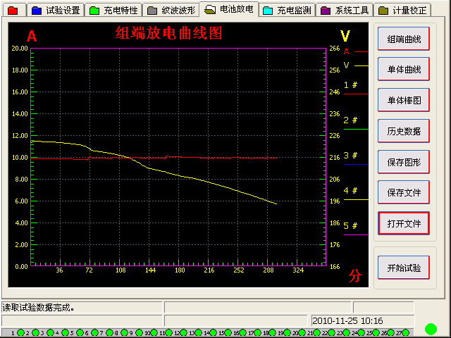 組端曲線 : 顯示蓄電池組組端電壓、放電電流隨時間的變化曲線。 組端電流曲線顏色和坐標系左側字母A顏色相同,組端電壓曲線顏色和坐標系右側字母V顏色相同。 X軸表示時間,左側y坐標表示放電電流,右側y坐標表示蓄電池組端電壓。