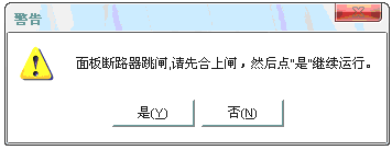 聽到繼電器“哐”的響聲后立即合上測試儀和負載箱斷路器開關進入試驗狀態(tài)(此試驗負載箱斷路器合上30A檔位,與測試儀主機自動合成60A),否則彈出“警告”窗口,用戶需先合上斷路器再點“是”(Y)進入試驗狀態(tài)。 加上負載箱時面板會提示電流超過設置的最大電流,此處直接點“是”(Y)按鈕。