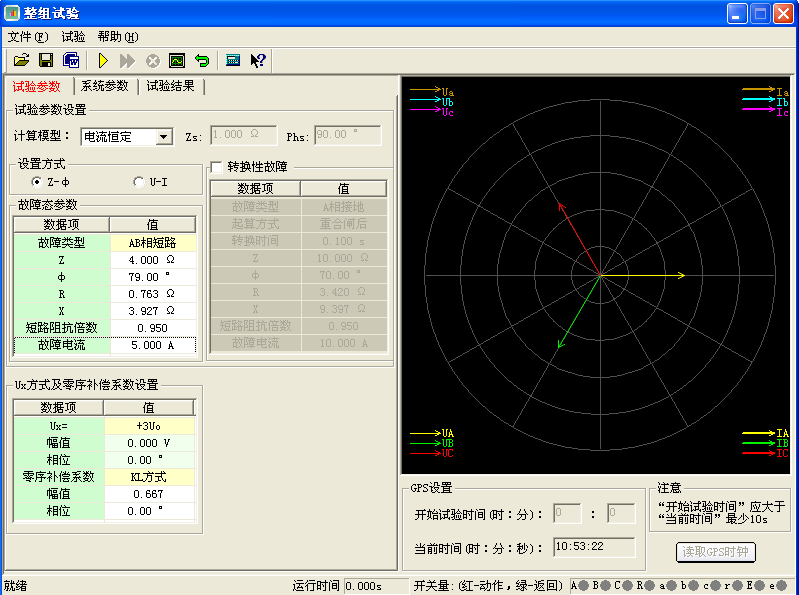 開始試驗點擊右三角按鈕或者按鍵盤上的“運(yùn)行”“確認(rèn)”鍵,繼保之星-S60開始輸出,先輸出空載狀態(tài)(按鍵前一直輸出正常狀態(tài),等待保護(hù)復(fù)歸,重合閘充電完成),然后再輸出故障狀態(tài),直到保護(hù)可靠跳閘,開入接點A、 B、C全部閉合,接著再輸出重合閘狀態(tài),直到保護(hù)重合閘成功,開入接點 R閉合, 最后自動結(jié)束試驗,根據(jù)提示選擇是否保存試驗結(jié)果。