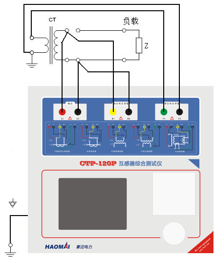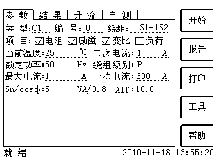 使用CTP-120P 互感器測試儀按照上圖接線方式進行勵磁試驗,參數(shù)設置頁面中的負荷請?zhí)钊雽嶋H負荷或者額定負荷。