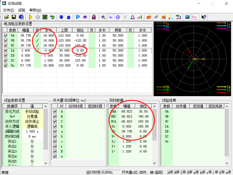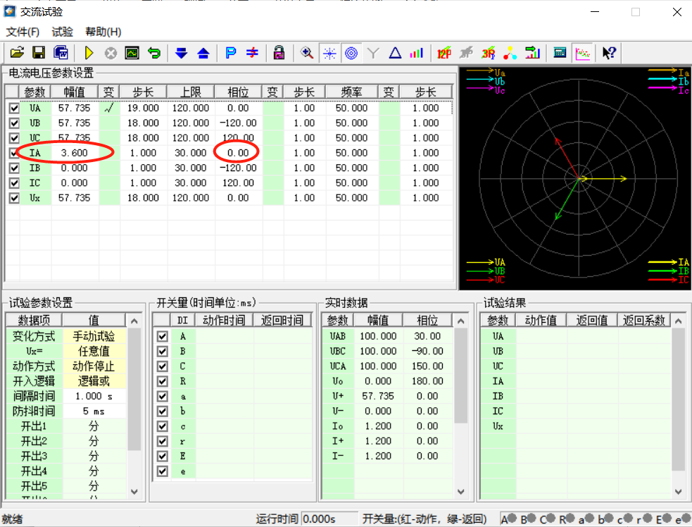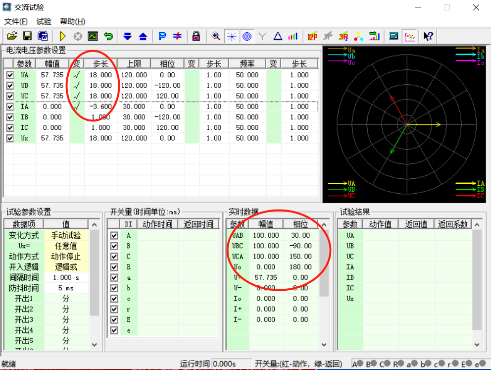 模擬A相接地故障,IA故障相角度為0°,在動作區(qū)內(nèi)點擊向下箭頭進(jìn)入故障狀態(tài)。