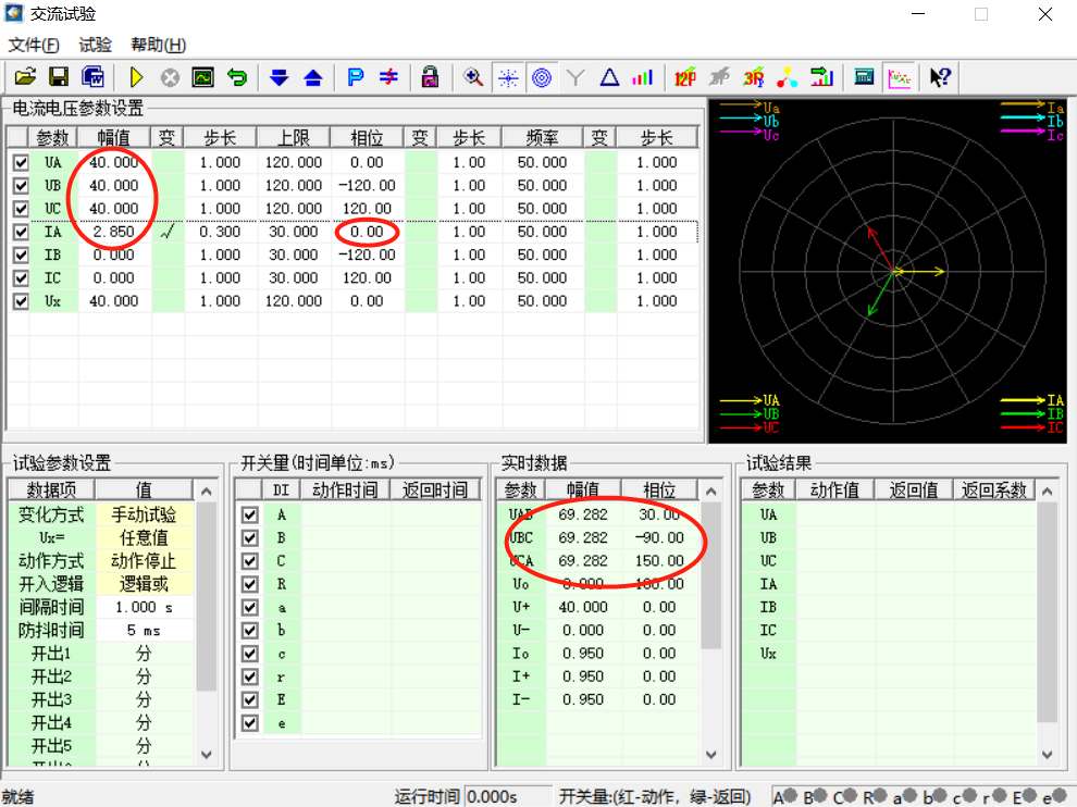 此時滿足低電壓和過流值條件,正方向保護(hù)動作,然后設(shè)置IA相電流為180°,同時驗證反方向不動。