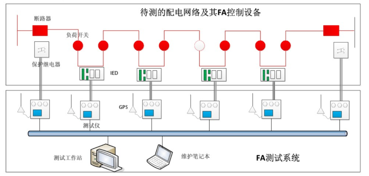 不停電狀態(tài)下,實(shí)現(xiàn)多點(diǎn)DTU/FTU/TTU終端的同步故障模擬,配合主站進(jìn)行故障區(qū)域判斷、故障隔離和供電恢復(fù)策略執(zhí)行,實(shí)現(xiàn)完整的饋線自動化(FA)功能測試;