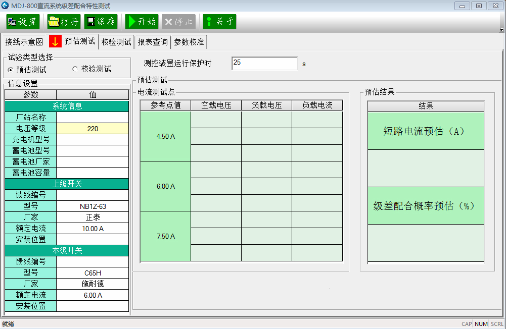 設(shè)置系統(tǒng)測(cè)控保護(hù)時(shí)間,點(diǎn)擊“開(kāi)始”按鈕,自動(dòng)進(jìn)行預(yù)估試驗(yàn)。 預(yù)估試驗(yàn)完成后估算出系統(tǒng)線間內(nèi)阻、預(yù)估短路電流和級(jí)差配合概率。