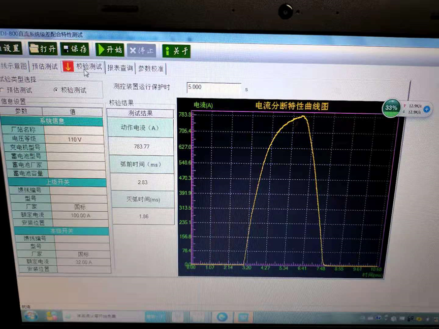 此次現(xiàn)場(chǎng)試驗(yàn)過(guò)程,MDJ-800 直流系統(tǒng)級(jí)差配合特性測(cè)試儀通過(guò)預(yù)設(shè)短路電流,直接進(jìn)行短路試驗(yàn)校驗(yàn)級(jí)差配合的選擇性,根據(jù)帶載小電流預(yù)估支路的短路電流,查表計(jì)算級(jí)差配合概率預(yù)估值,顯示短路動(dòng)作電流、弧前時(shí)間、滅弧時(shí)間及開(kāi)關(guān)分?jǐn)嗵匦郧€等,解決了以往級(jí)差試驗(yàn)過(guò)程繁瑣、工作量大等困難,大大縮短了操作時(shí)間,提高了直流系統(tǒng)運(yùn)行可靠性,保障電網(wǎng)安全可靠運(yùn)行。