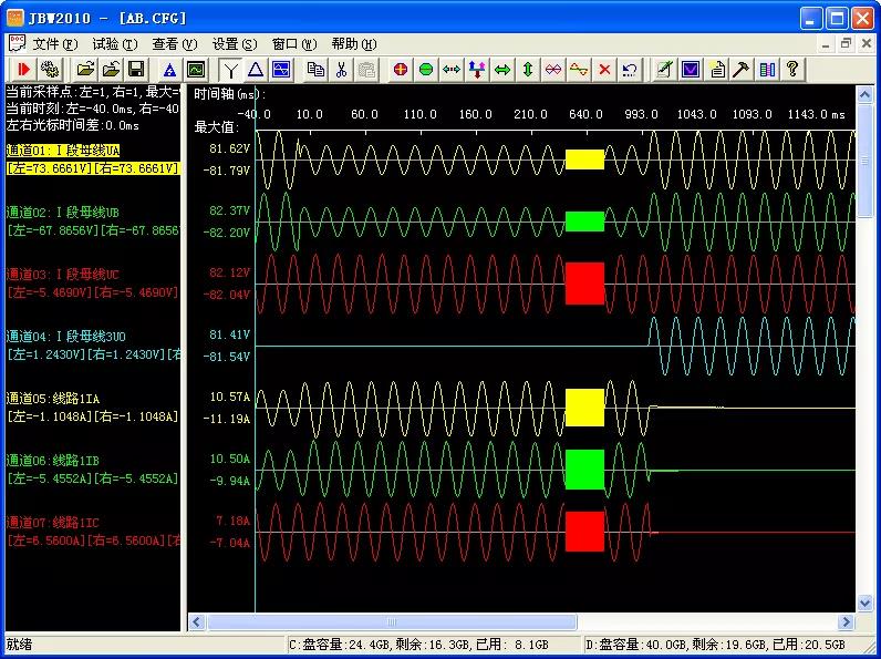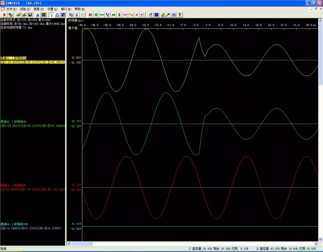 打開波形文件,可實(shí)現(xiàn)啟動(dòng)在線錄波、錄波參數(shù)設(shè)置、故障回放功能、波形監(jiān)視分析、Y方式顯示波形、三角方式顯示波形、波形縱向電壓和電流分別比例顯示、波形縱向(高度)放大和縮小、波形截圖保存等功能。
