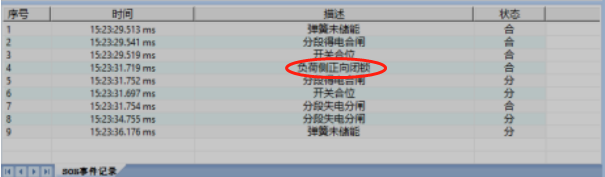 狀態(tài)序列設(shè)置完成后開始試驗(yàn),觀察開關(guān)狀態(tài),出現(xiàn)先合閘再跳閘狀態(tài)變化,同時(shí)配電之星-P2200 模擬主站收到一個(gè)負(fù)荷側(cè)正向閉鎖的SOE信息。