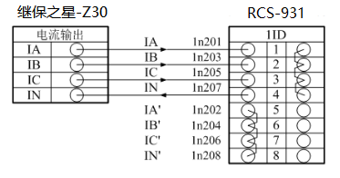將繼保之星-Z30 電流輸出端“Ia”、“Ib”、“Ic”分別與保護裝置的交流電流“IA”、“IB”、“IC”(極性端)端子相連;