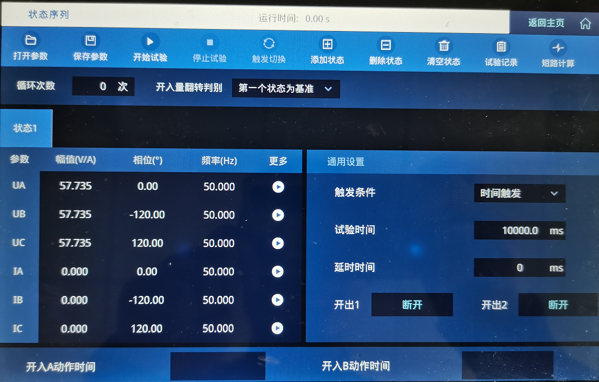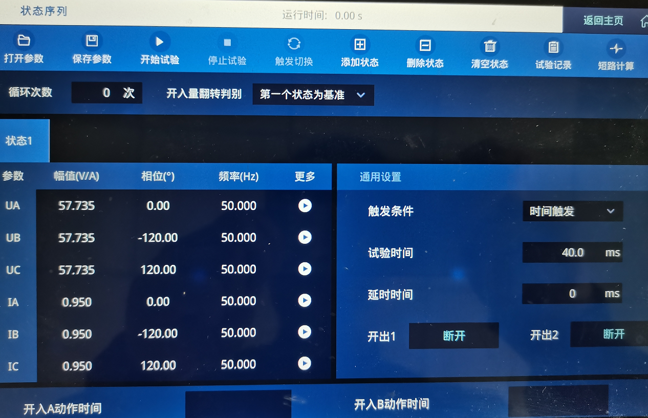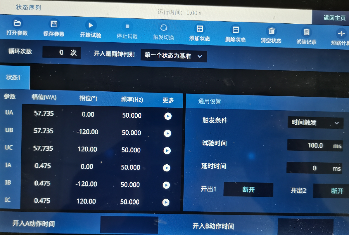 UA=UB=UC=57.734V,IA=IB=IC=0A,電壓電流均為正序,觸發(fā)方式: