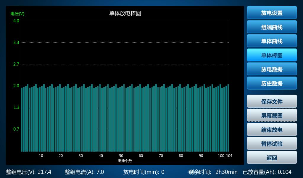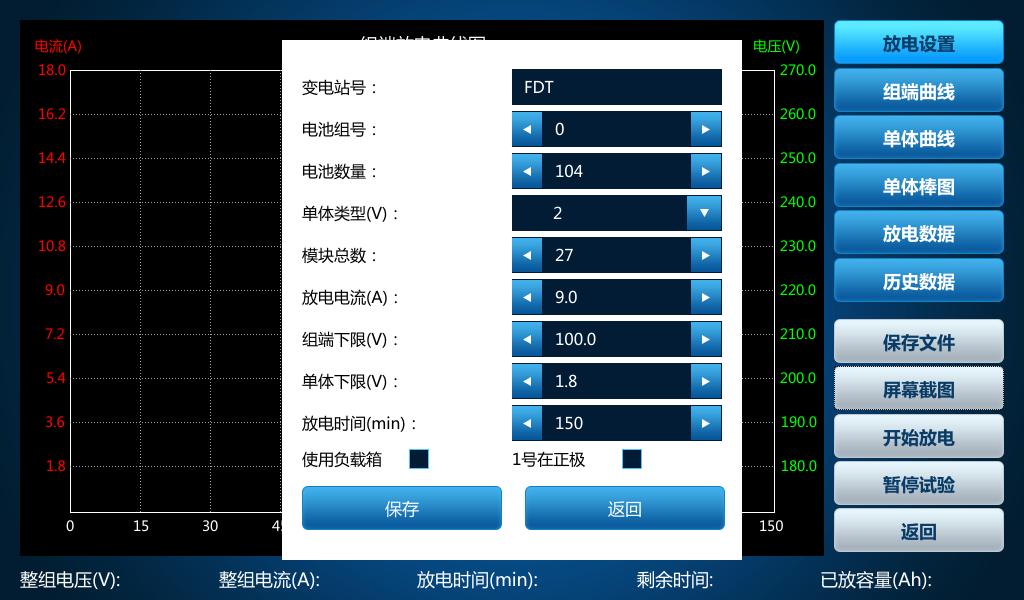根據(jù)上述操作進行試驗,試驗結(jié)束后空開會自動關(guān)閉,若在放電試驗中途空開斷開,可能是因為電池單體電壓或組端電壓達到了設(shè)置電壓的下限,同時屏幕上會彈出跳空開原因。