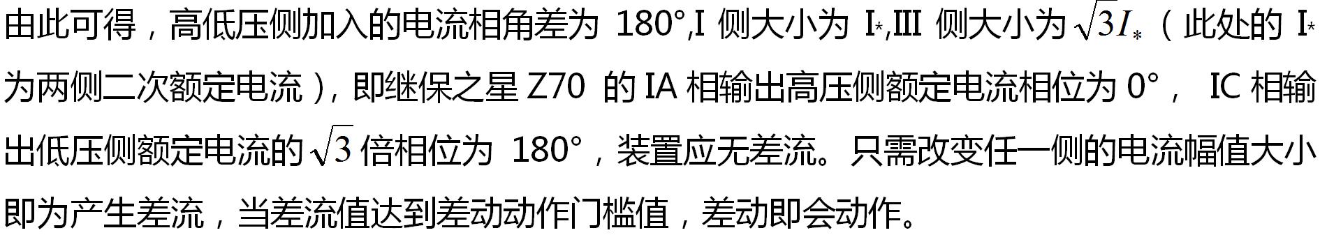 即B、C兩相都會受到影響。 為避免受此影響,使得檢驗(yàn)更容易進(jìn)行,高中壓側(cè)采用的接線方式為,電流經(jīng)繼保之星Z70 的IA相,從高壓側(cè)A相流入B相流出。