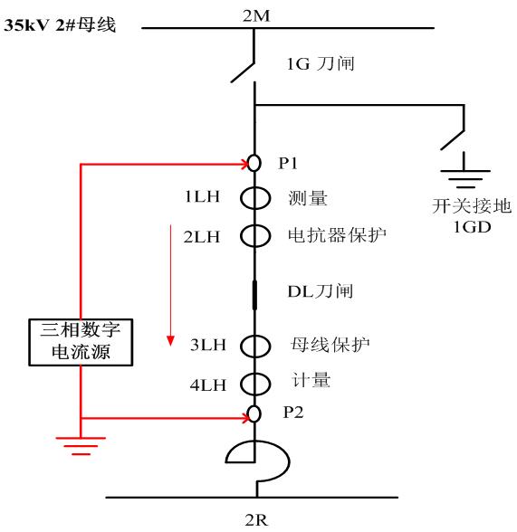 1)電流源接線: 合上隔離刀閘DL,斷開(kāi)隔離刀閘1G,斷開(kāi)接地開(kāi)關(guān)1GD,將P2接地,使用HTA-3300 三相數(shù)字式智能大電流源從P1地排接入三相電流IA、IB、IC。