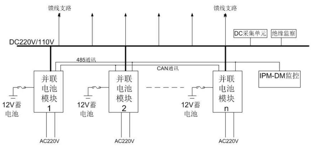 并聯(lián)型直流電源系統(tǒng)由若干個并聯(lián)電池模塊高壓輸出端并聯(lián)組成,每個模塊可配置12V蓄電池,高壓DC220V/110V。 系統(tǒng)配置直流饋線支路若干,絕緣監(jiān)察裝置、開關量監(jiān)測裝置、系統(tǒng)監(jiān)測觸摸屏裝置等。