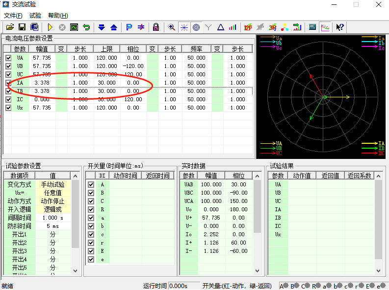 根據(jù)以上試驗(yàn)接線與分析,通過(guò)繼保之星-7000S 兩相電流即可做發(fā)變組差動(dòng)平衡值,發(fā)電機(jī)機(jī)端A相施加電流IA=3.378A∠0°,中性點(diǎn)側(cè)A相流入電流IB=3.378A∠0°。