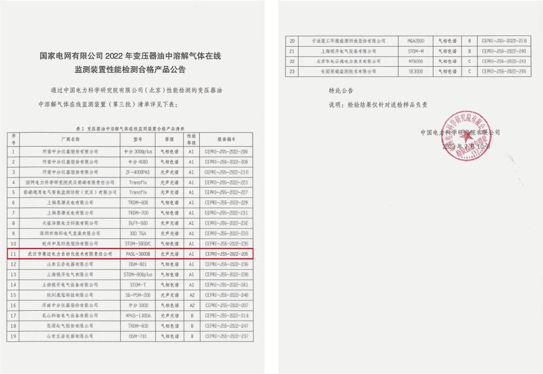 近期,中國電力科學(xué)研究院發(fā)布了國家電網(wǎng)有限公司2022年變壓器油中溶解氣體在線監(jiān)測裝置性能檢測合格產(chǎn)品公告, 武漢豪邁 自主研發(fā)的“ PASL-3000 激光光聲光譜變壓器油中氣體在線監(jiān)測系統(tǒng) ”順利通過全性能檢測,達(dá)到性能等級A1級,成為國內(nèi)僅有的3家采用激光光聲光譜原理裝置通過A1級檢測的公司之一。