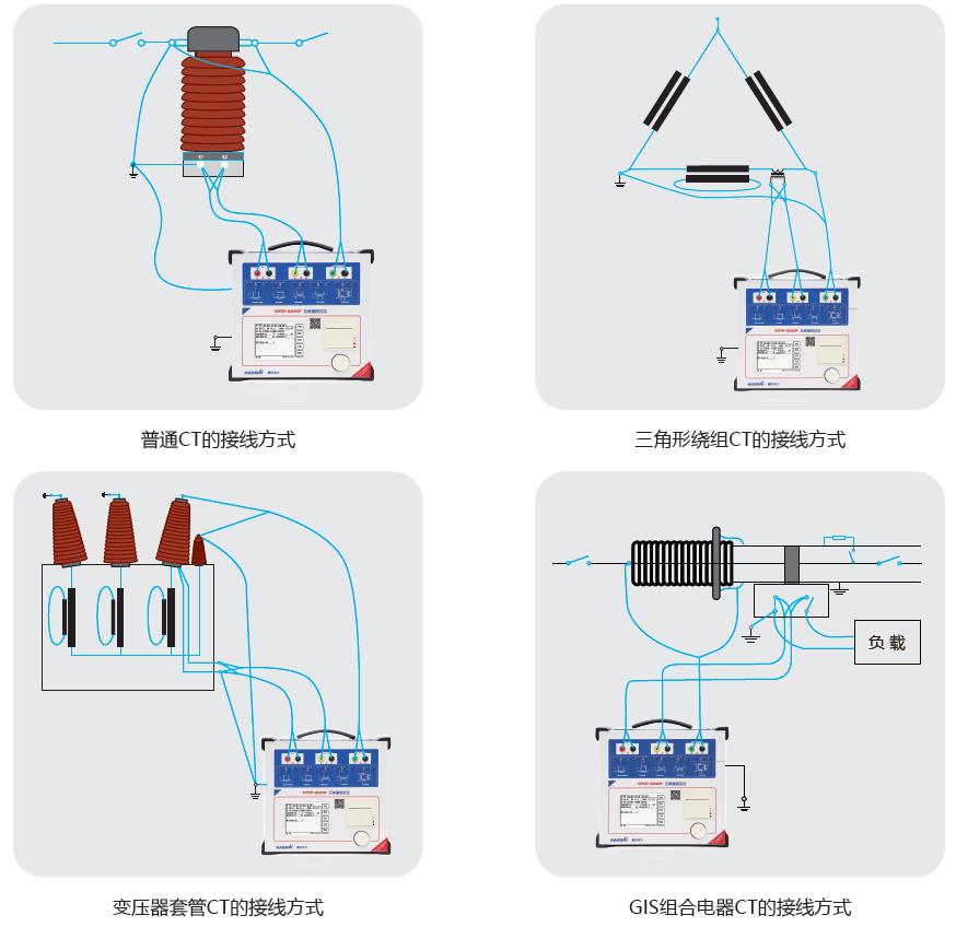 CTP 互感器測(cè)試儀面板上標(biāo)記了CT/PT的變比、伏安特性試驗(yàn)等一、二次試驗(yàn)端子接線圖,示意圖如下: