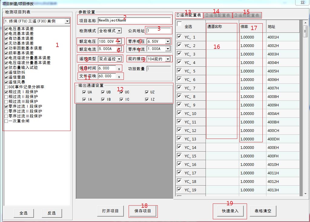 新設(shè)備若無(wú)配置方案,進(jìn)入項(xiàng)目管理后首先更改①處項(xiàng)目名稱(chēng),根據(jù)終端的參數(shù)更改④⑤⑥⑦處的額定值,保證⑨處的規(guī)約接口為104規(guī)約。 在①中可對(duì)所需要的試驗(yàn)項(xiàng)目進(jìn)行定值設(shè)置,其中2、3處的值根據(jù)終端保護(hù)定值設(shè)置相應(yīng)的幅值定值及時(shí)間定值。 4中故障點(diǎn)為該試驗(yàn)對(duì)應(yīng)的點(diǎn)位在點(diǎn)表中的位置,比如“相過(guò)流Ⅰ段”點(diǎn)位在點(diǎn)表中是8號(hào)點(diǎn)位,則在故障點(diǎn)的“值”中填寫(xiě)8。