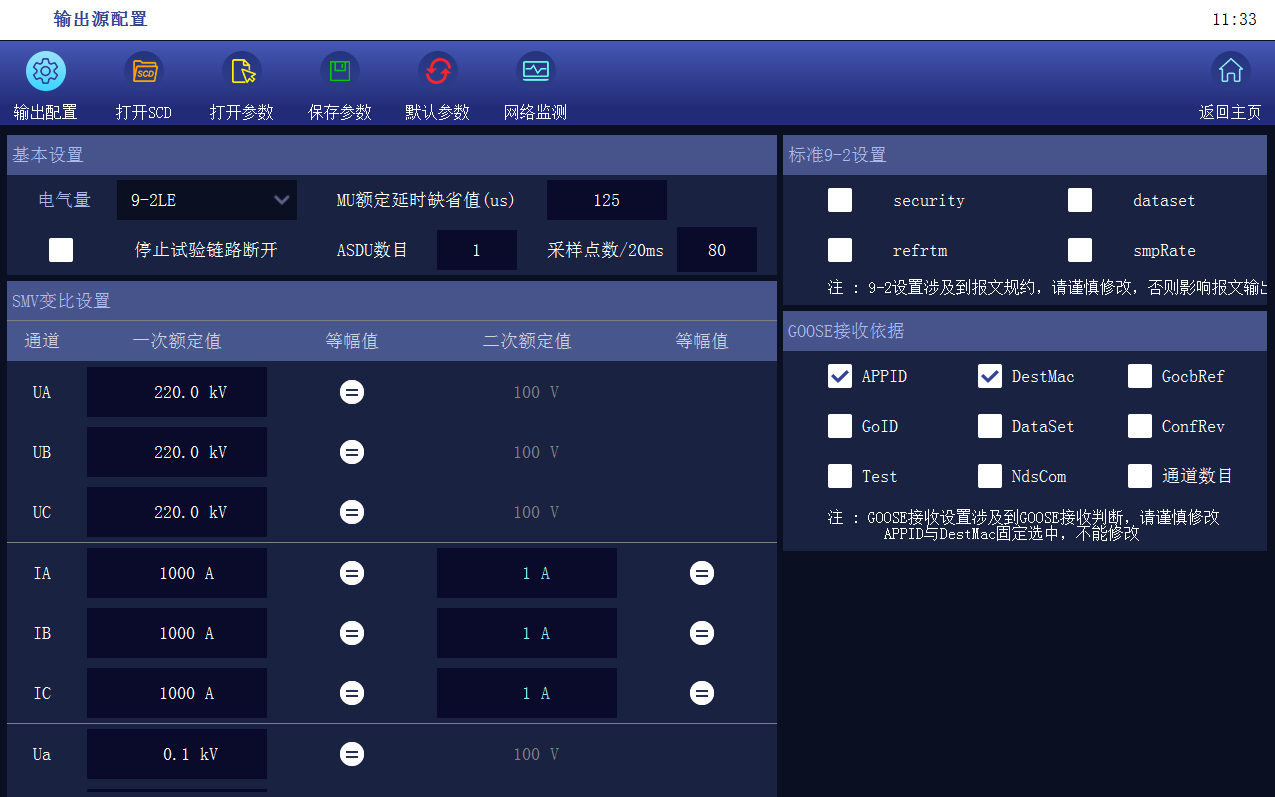 ⑥在輸出配置菜單中配置SMV變比設(shè)置,此處只需更改電壓電流一次額定值,其他選擇默認(rèn)。