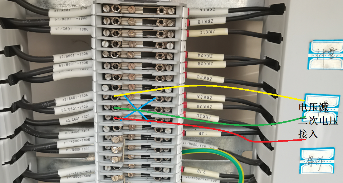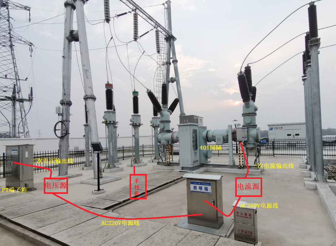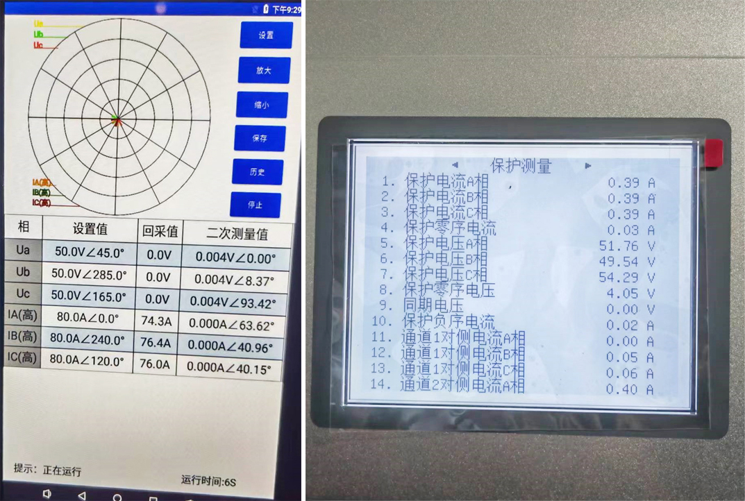 為了查看電流回路的絕對相角,需要施加二次電壓,通過HTV-6000 直接輸出額定電壓至保護(hù)裝置,以A相母線電壓為基準(zhǔn),可在各間隔保護(hù)裝置上查看CT二次幅值角度,根據(jù)CT極性端定義由此判斷向量極性是否正確。