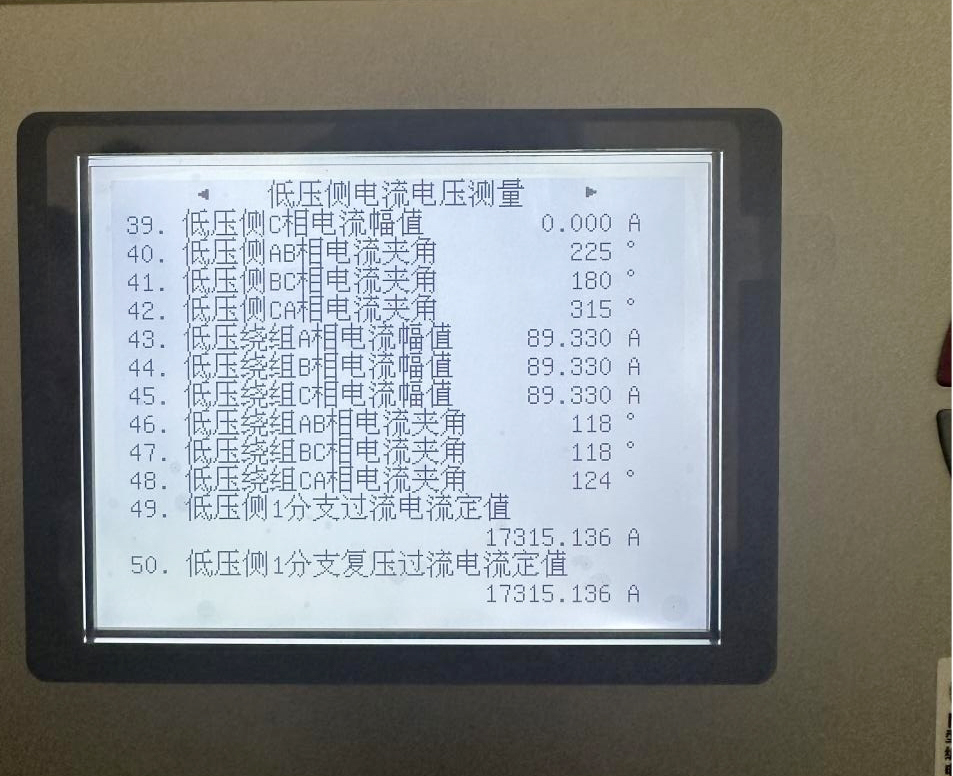 中壓側(cè)額定電壓525/√3kV、低壓側(cè)額定電壓110kV,中壓側(cè)施加35A電流,計算出低壓繞組電流約為90A,與保護裝置顯示結(jié)果一致,查看后臺及其他采樣結(jié)果均正常,低壓繞組相間為120°正序,完成變電站低壓繞組的保護向量檢查。 以上同理完成變壓器高中壓繞組的保護向量檢查。