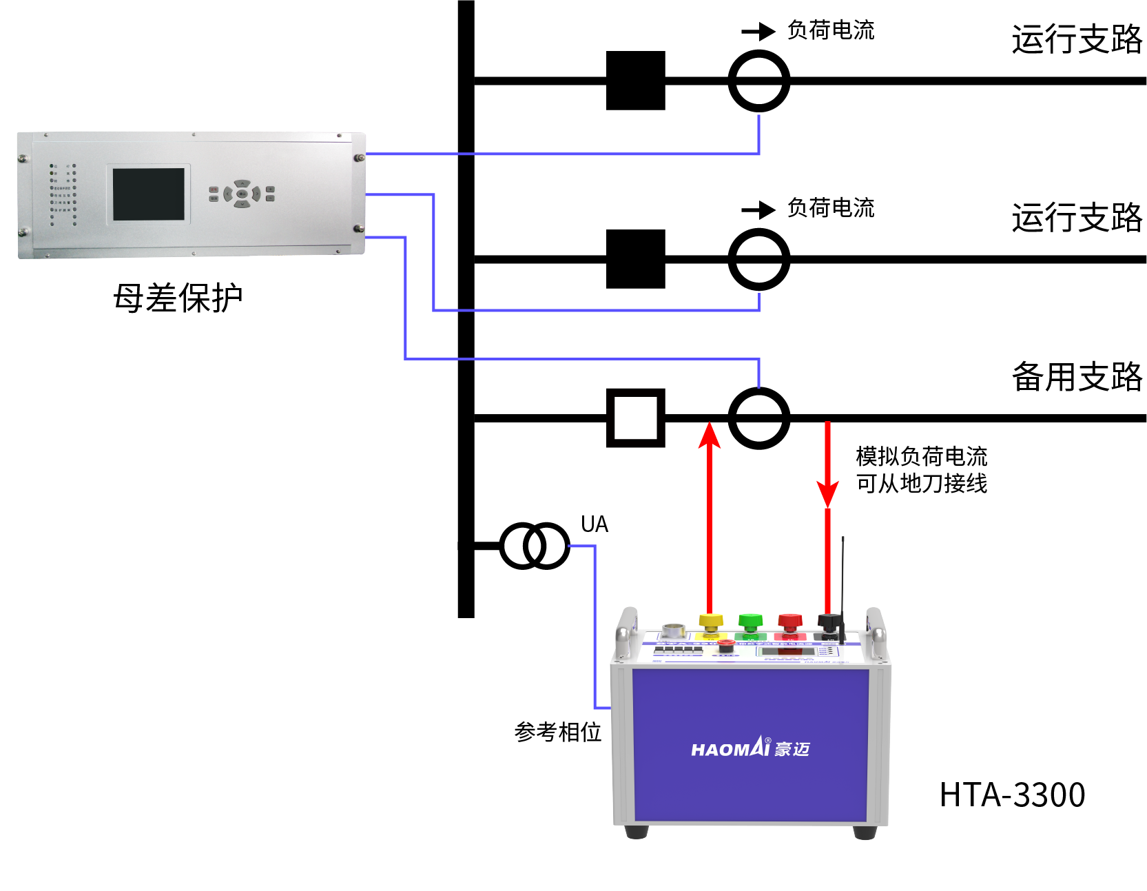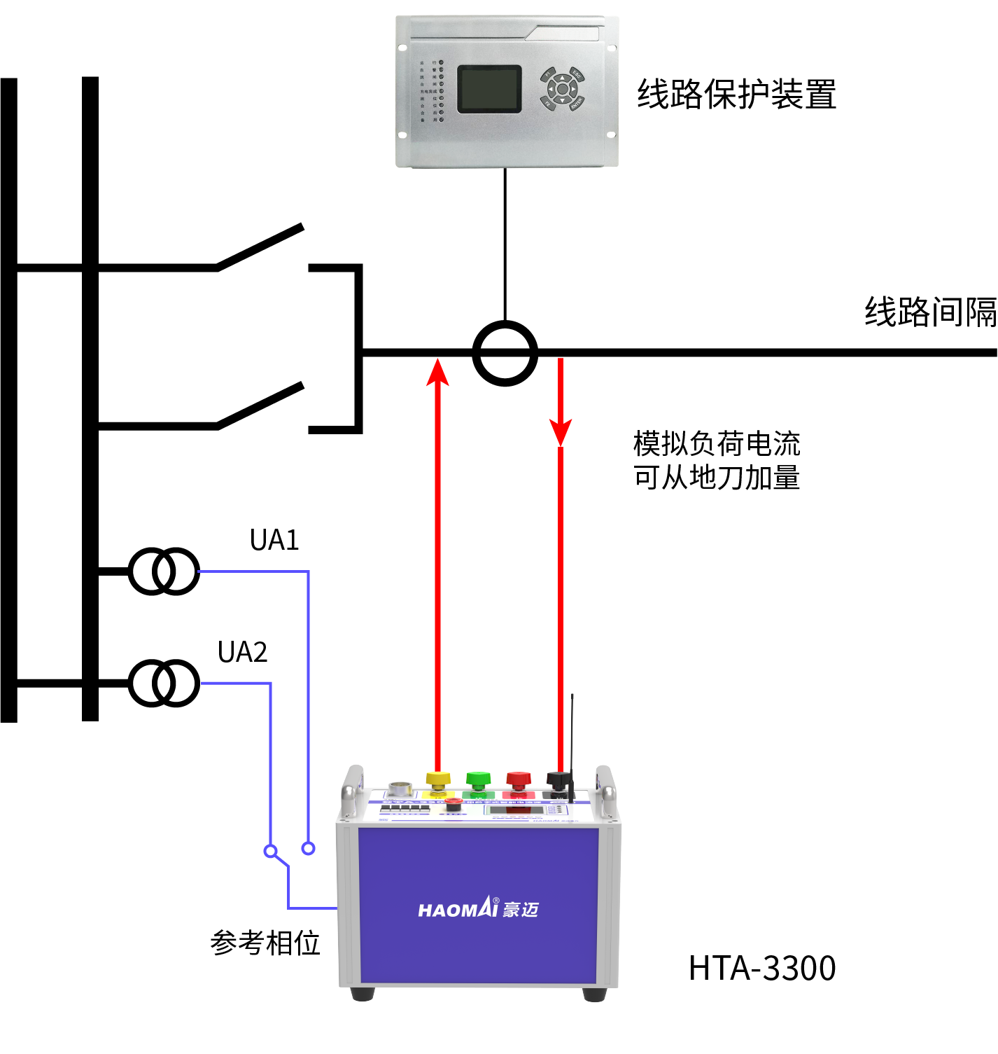 雙母線系統(tǒng)線路間隔停電更換保護(hù),可以采用HTA-3300 三相數(shù)字式智能大電流源輸出0-300A電流加到CT一次側(cè),該電流分別與兩段母線PT的二次運(yùn)行電壓UA1、UA2同步,模擬線路間隔分別接入兩段母線時(shí)的負(fù)荷電流,用于對(duì)該間隔的二次回路的向量檢查, 也可模擬輸出零序電流用于檢查N線。