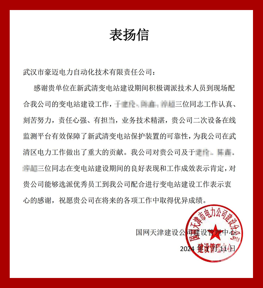武漢豪邁收到國網(wǎng)天津建設(shè)公司發(fā)來的表揚(yáng)信,信中對我司 二次設(shè)備在線 監(jiān)測平臺為武清區(qū)電力工作做出的重大貢獻(xiàn),以及常駐新武清變電站 技術(shù)服務(wù)團(tuán)隊在變電站建設(shè)期間表現(xiàn)出的精湛技術(shù)和工作成效表示肯定和衷心感謝,對技術(shù)團(tuán)隊“工作認(rèn)真、刻苦努力,責(zé)任心強(qiáng)、有擔(dān)當(dāng) ”的服務(wù)精神給予高度贊揚(yáng)。