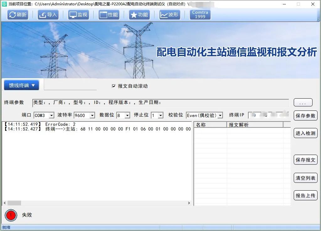 測試項目配置完成后,返回主界面點擊配網(wǎng)測試,導入配置的測試案例,填寫通訊模塊與測試儀相連接的串口、波特率、數(shù)據(jù)位、停止位、校驗位、終端SIM卡IP,填寫完畢后點擊保存與刷新。當收到主站回復時,黃色與綠色提示燈交替閃爍,表示與主站通訊已建立,可進行自動對點測試。