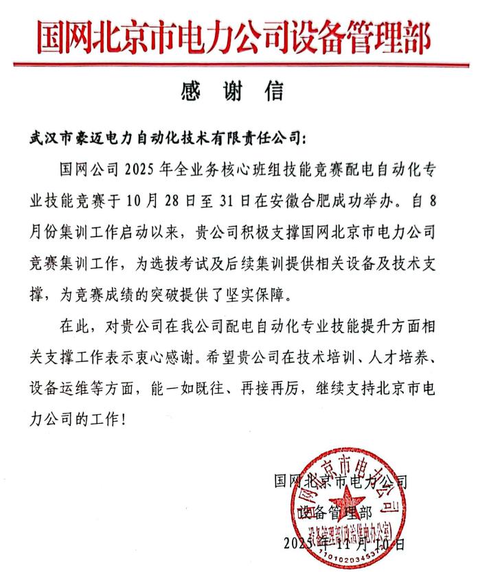 近日,武漢豪邁接連收到國(guó)網(wǎng)河南省電力、國(guó)網(wǎng)北京市電力發(fā)來(lái)的感謝信,信中高度肯定并感謝我司對(duì)國(guó)網(wǎng)公司2025年全業(yè)務(wù)核心班組技能競(jìng)賽配電自動(dòng)化專(zhuān)業(yè)技能競(jìng)賽集訓(xùn)工作的積極支撐??蛻?hù)在信中表示,武漢豪邁為選拔考試及集訓(xùn)提供相關(guān)設(shè)備及技術(shù)支撐,為競(jìng)賽成績(jī)的突破提供了堅(jiān)實(shí)保障,并對(duì)公司在技術(shù)培訓(xùn)、人才培育及競(jìng)賽支撐方面展現(xiàn)出的專(zhuān)業(yè)能力與責(zé)任擔(dān)當(dāng)表示高度贊賞。